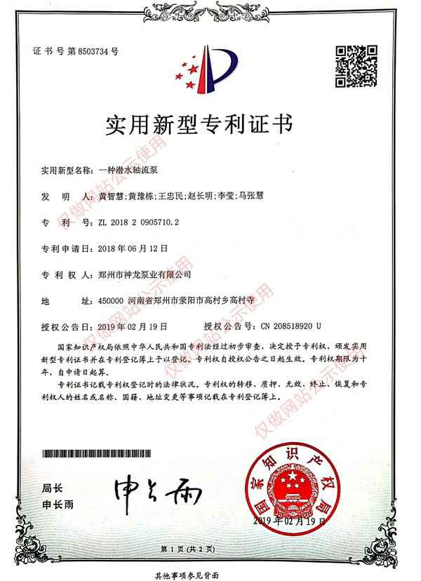 潜水轴流泵专利证书